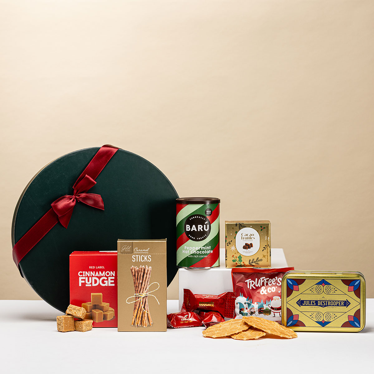 Offrez la douceur d’une soirée de Noël douillette avec le Cozy Holiday Hot Chocolate, Tea & Sweets Gift Box. Présenté dans une luxueuse boîte vert foncé ornée d’un ruban rouge, ce coffret réunit tout ce qu’il faut pour profiter d’un moment chaleureux rempli de chocolat chaud, biscuits et gourmandises.