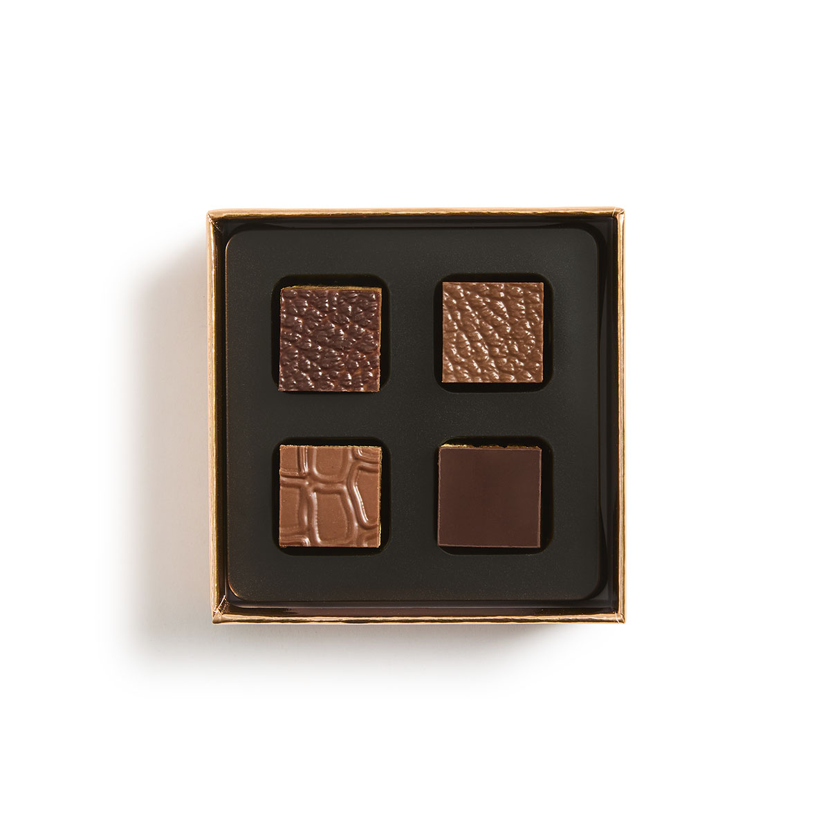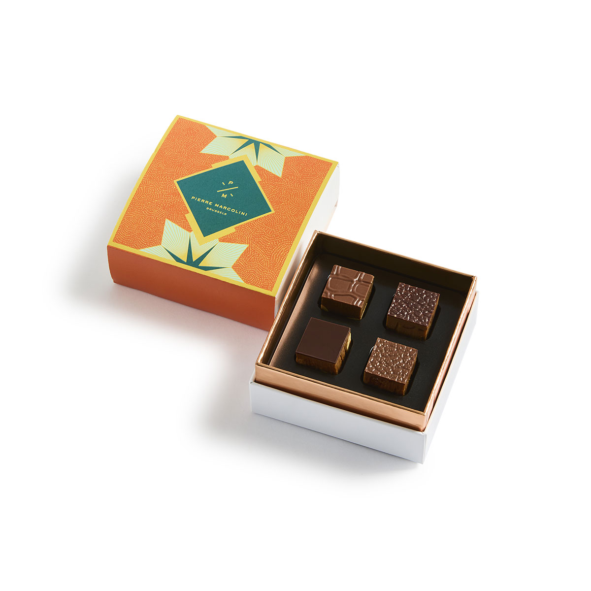 Ingrédients: sucre, noisettes, amandes, fèves de cacao torréfiées, poudre de lait, beurre de cacao, morceaux de caramel (contient : lait), feuilletine (contient : gluten, lait), glucose, café, sel, lécithine de tournesol, huile de pépins de raisin, vanille naturelle.