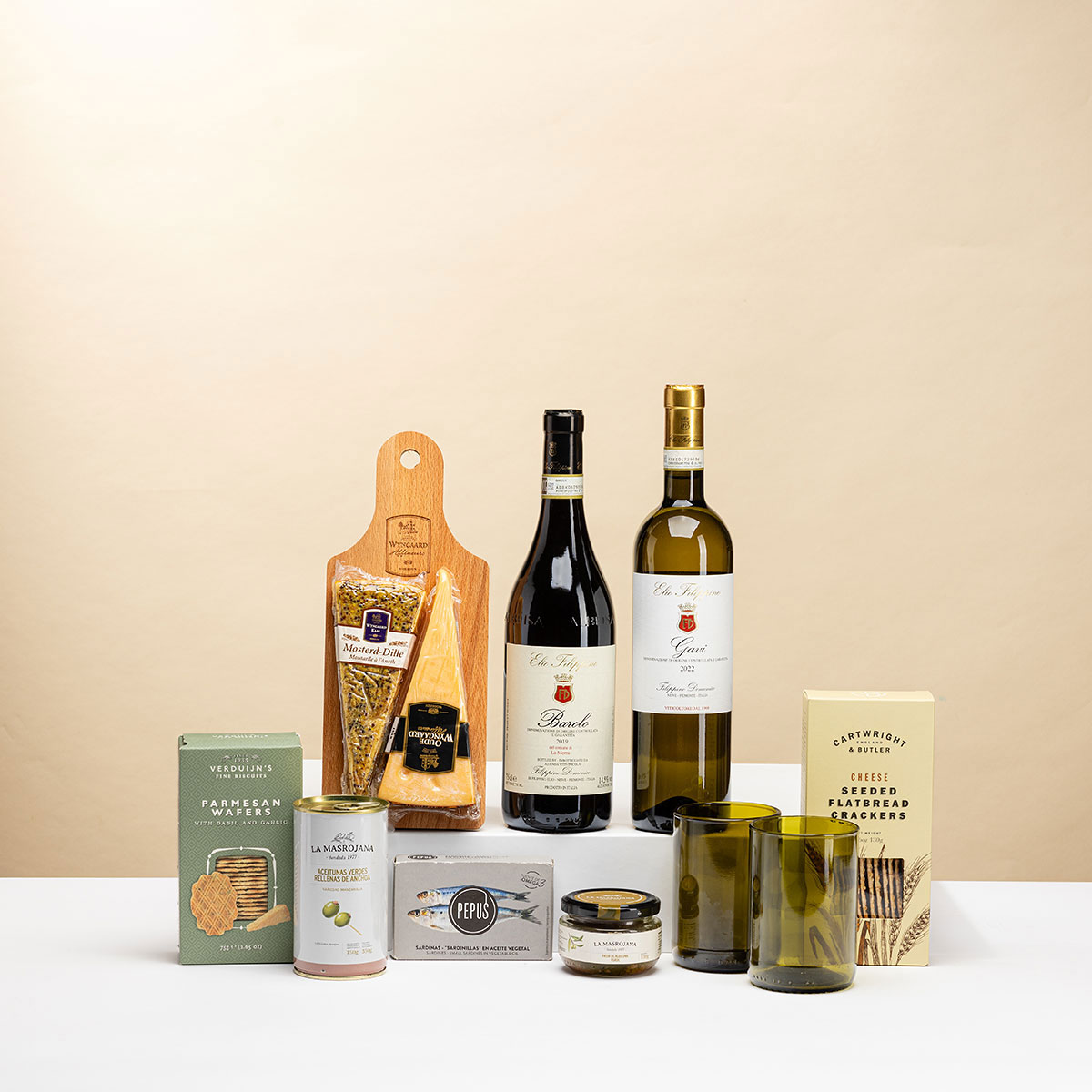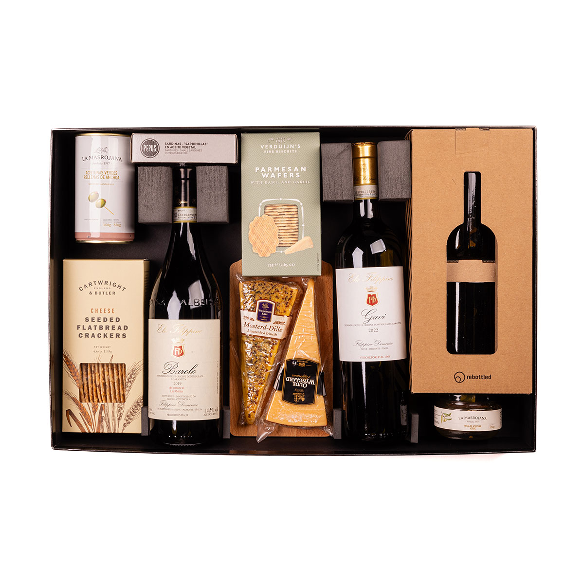 Sirotez le vin dans les gobelets Rebottled tout en dégustant les fromages Wyngaard Dutch Aged & Mustard sur un plateau en bois. Un assortiment de crackers croustillants, de tapenade, de mini-sardines et d'olives aux anchois complète cet impressionnant cadeau vin et fromage.